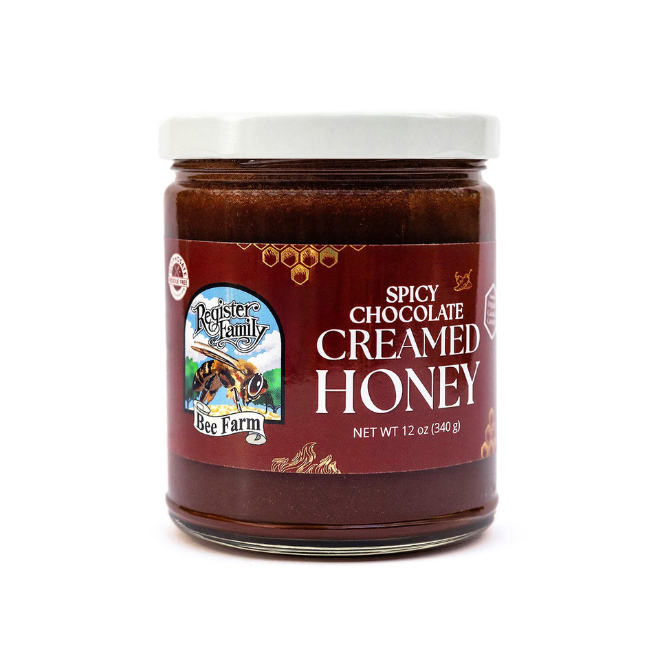 Our Spicy Chocolate Creamed Honey features raw honey blended with aromatic Organic Cacao and Organic Cayenne. It's a delightful treat made from crystallized honey, creating a smooth and spreadable texture similar to butter. This specialty honey is known as "Spun Honey" or "Whipped Honey."